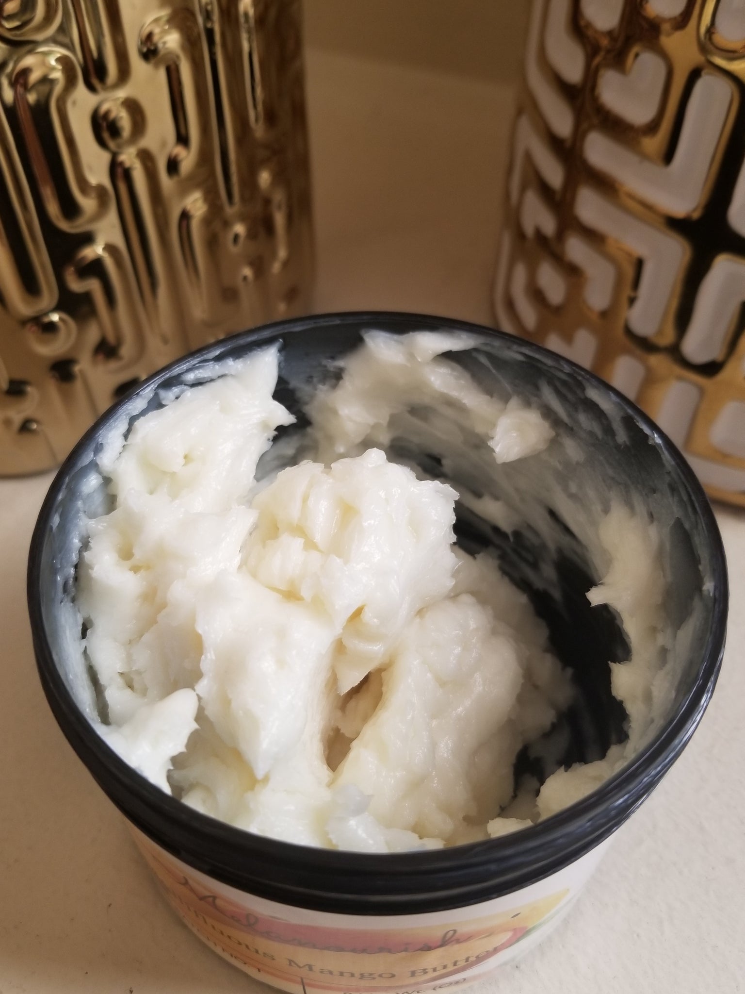This mango butter works wonders. It is infused with 5 natural oils and whipped into a rich moisturizing butter. The ingredients include natural raw mango butter, sweet almond oil, avocado oil, vitamin E oil, moringa oil, juniper oil, and beach wood mango fragrance oil. Rub on body as needed to restore moisture to skin.